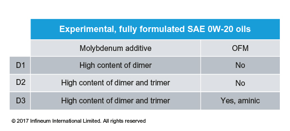 To test the theory that molybdenum is necessary to produce superlubricity, three new SAE 0W-20 lubricant formulations with high molybdenum were fully formulated with a careful mixture of all the necessary componentry.