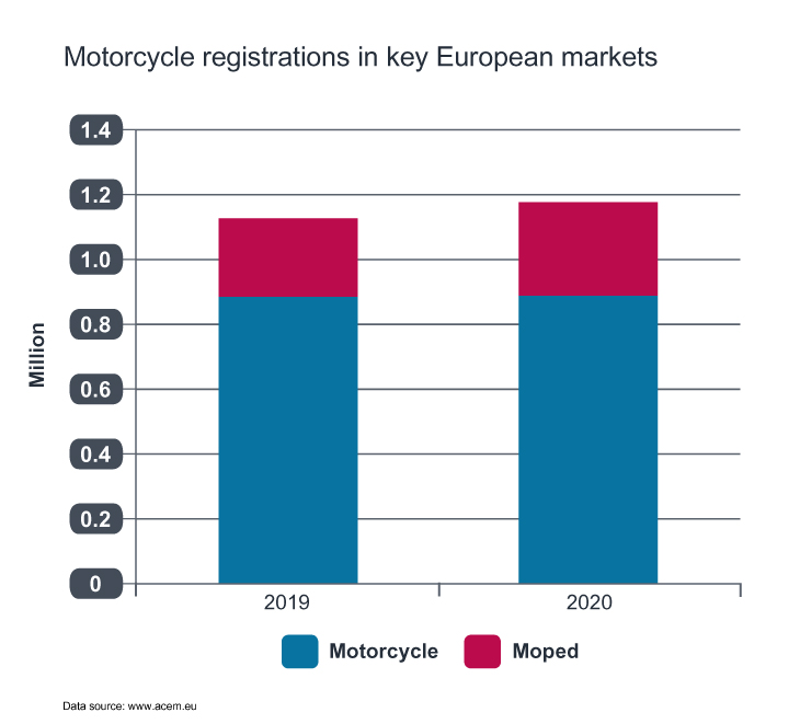 While global passenger car sales figures slumped in the wake of the COVID-19 pandemic, motorcycle sales were impacted to a much lesser extent. Yes, global sales were down by some 5%, but for example, some of the key markets in Europe experienced a slight sales growth. In terms of powertrain trends in Europe, while there was some uptake of electric models, over 90% of machines purchased in 2020 were powered conventionally. And these trends continue. In Q1 2021, the region’s sales were up by just over 10% on the previous year and electric models accounted for some 8% of sales.