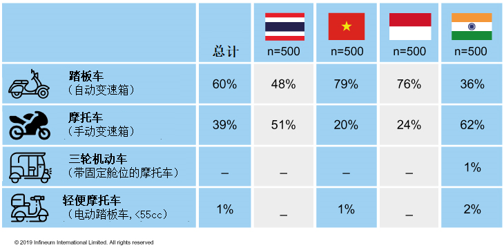 在我们的调查样本中,印度拥有摩托车而非踏板车的骑手比例更多。 但是,在越南和印度尼西亚,踏板车更受欢迎,而在泰国,摩托车和踏板车的使用比例几乎是50/50。 整个样本中只有极少数的骑手报告说他们使用电动脚踏摩托车和三轮机动车。
