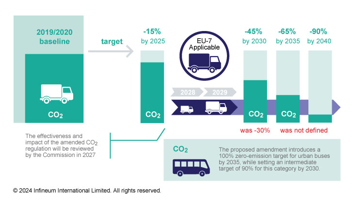On January 18 2024, just one month after the agreement on Euro 7, the European Council and the European Parliament reached a provisional political agreement on CO2 emission standards for heavy-duty vehicles. Overlaying the Euro 7 timeline and the heavy-duty CO2 reduction targets in the diagram below highlights the challenge facing OEMs.